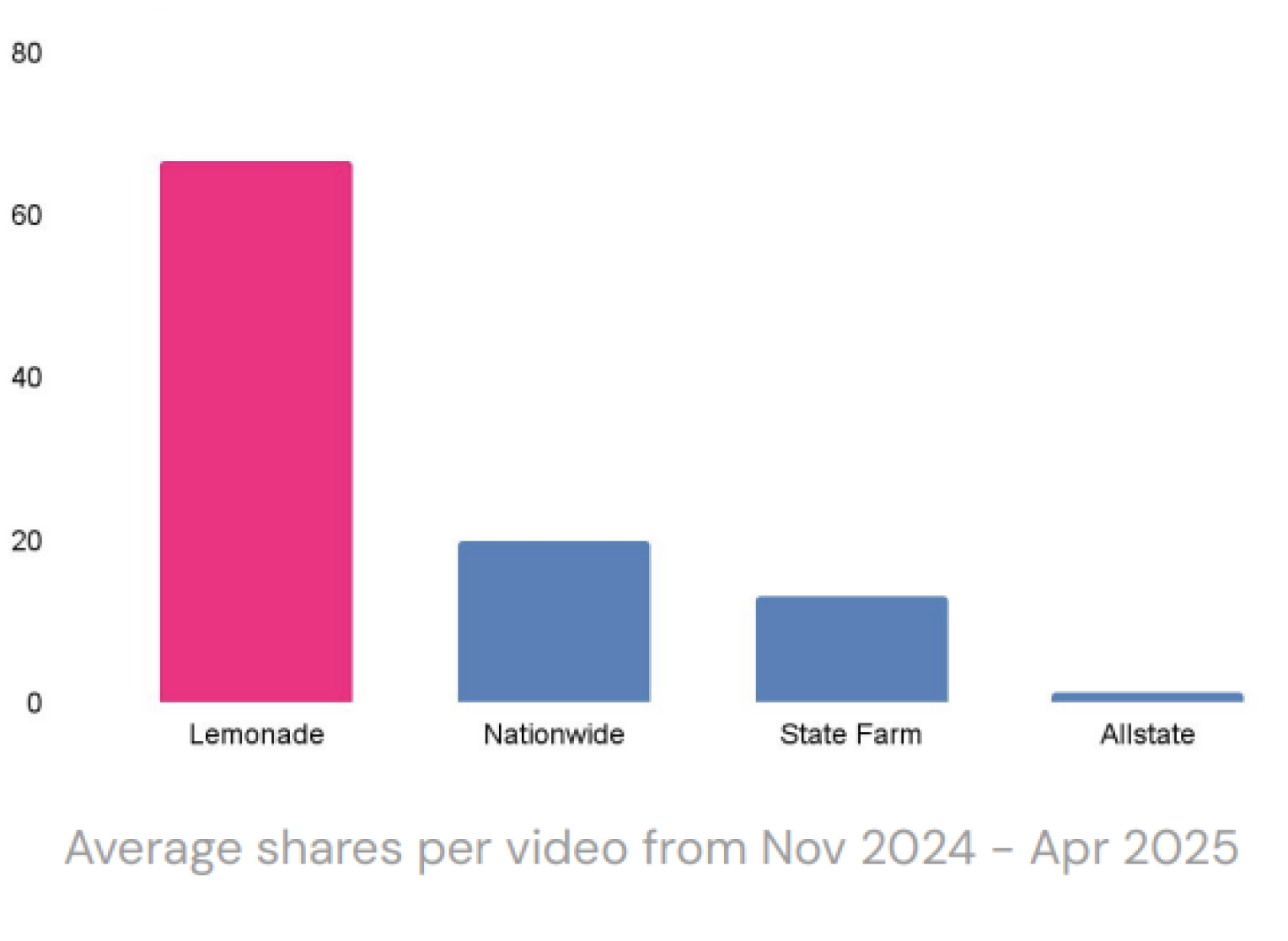 Lemonade’s content is built to be shared, averaging 67 shares per video and outperforming peers like Nationwide (3×) and State Farm (5×)1 . But while it punches above its weight in virality, it lags in follower count; hosting under 10% the social scale of legacy brands on TikTok, Facebook, YouTube, and X.
