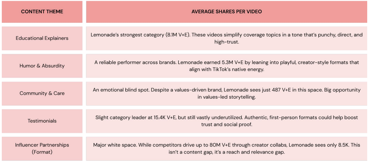Data reflects total video views and engagements (V+E) by content type, revealing areas where Lemonade either overperforms, underperforms, or has untapped potential