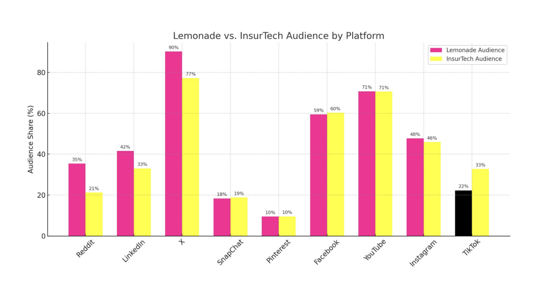 - Reddit Usage: 35.4% (Lemonade) vs 21.24% (InsurTech) - a 1.66× multiplier.