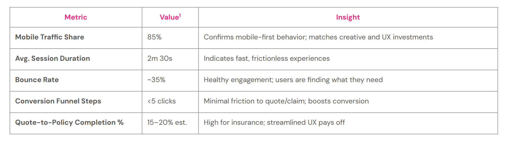 1 Performance metrics reflect modeled website behavior data collected as of May 2025. Values are estimates based on aggregated digital activity across mobile and desktop devices. Funnel completion percentages are directional and should be interpreted as indicative, not absolute.